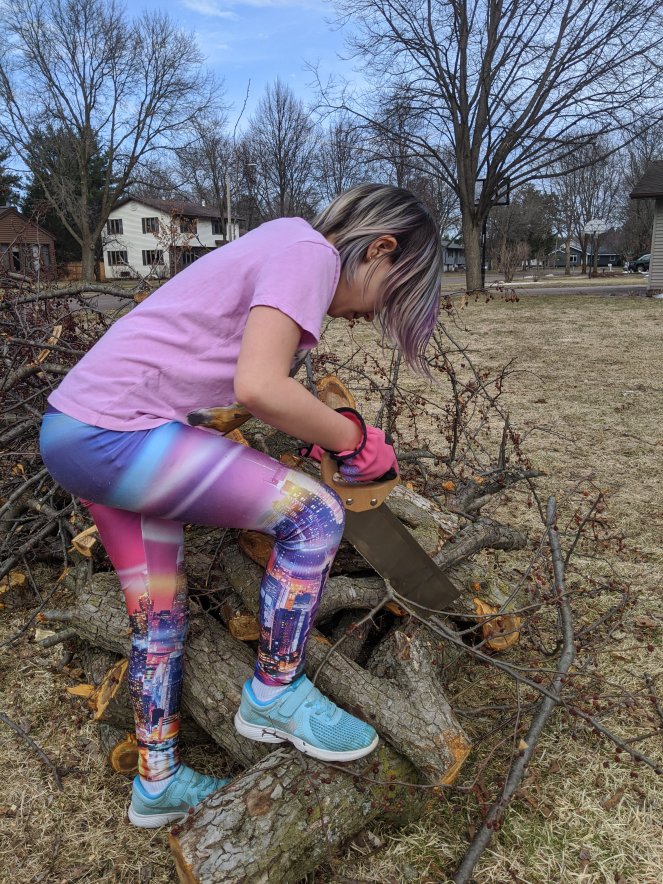So I produced a had saw and we took to the hard. I showed her how to use it safely and she went to town. Off went the little branches and nubbs from her main branch. Smaller stiff branches were selected and cut to size for arrows as well. When she had everything she needed we took to the house. Taylor grabbed her pocket knife and went out on the deck to shape and widdle her loot. After an hour or so she became cold and came inside.