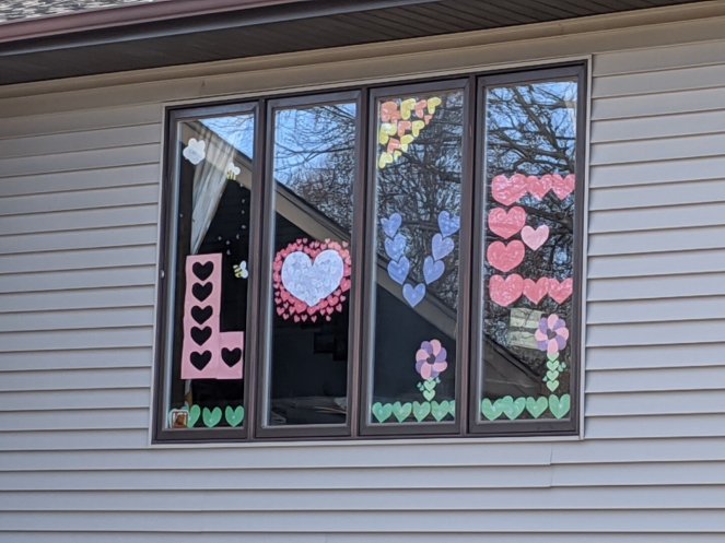 One art project we did was inspired by the Happy Heart Hunt. This was a wonderful three hour project. We talked and laughed while we cut out hearts. I feel like this gave us the opportunity to talk and bond in a very low pressure situation. While we were taping our design to the window there was a moment of Uh Oh! The word LOVE was facing us…it was backwards to everyone walking by. So very carefully we removed and flipped the hearts.